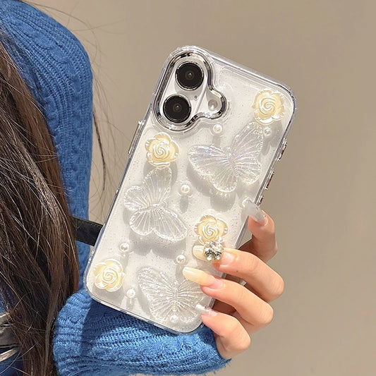 Pearl White Rose 3D Butterfly Clear Phone Case